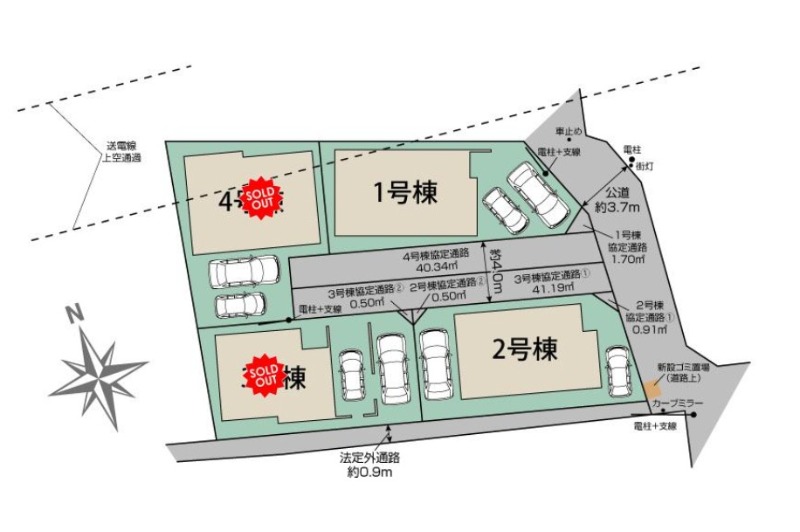 備考・特記事項 協定道路(敷地面積に含む)2号棟1.41㎡。協定部分については地役権設定登記を行います。費用:買主負担。電柱・支線が敷設されています。36.81㎡送電線下につき地役権が設定されています。TVアンテナ(電波障害等によるケーブルTV、共聴アンテナ)の申込はお客様負担です。図面と現況に相違がある場合、現況優先とします。司法書士、土地家屋調査士は売主指定です。網戸は東栄ホームサービスへの発注となります。なお、表示価格は建物引渡20日前迄の申込が条件となります。